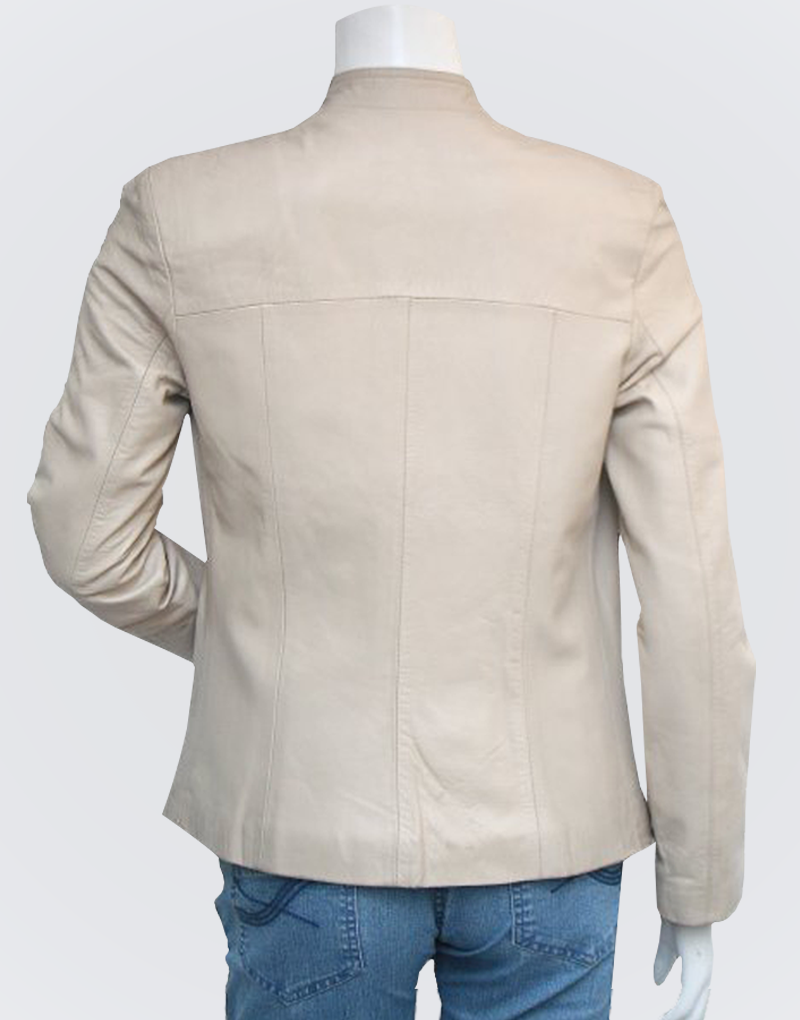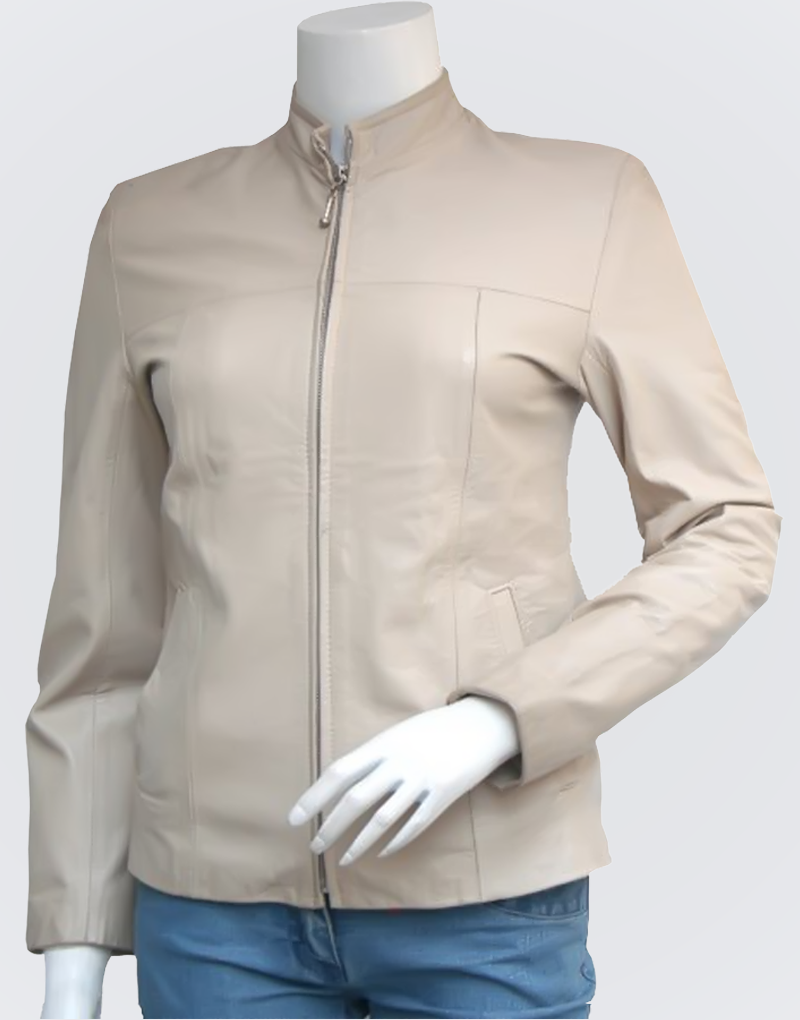 This Designer Jacket speaks for itself as its timeless beauty is hard to explain. However, the Quality of this Slim Designer Cream Leather Jacket Women is quite explicable and vivid. Full Grain Leather is passionately cut and stitched into this gorgeous leather armor. Its extravagant design features a front zipper closure and its simple outlook is bound to accord unmatched classy looks to its wearer. A banded collar and elegant zipper hook slider that almost looks like a necklace peeking out. This Leather Jacket has all the potential to add heaps to your femininity as well as to become the pride of your wardrobe.
